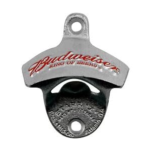 Mount this classic Budweiser bottle opener on your wall and it'll always be ready and waiting! Unlike a traditional handheld beer bottle opener, this priceless cast iron tool stays in one place. Whether you install it behind your bar or right in your garage, you can say goodbye to searching for an opener and fumbling through your key ring. Makes a great gift! Don't forget the cap catcher. In stock and ready to ship. Features: Made of cast iron with a silver finish. Embossed logo. Officially licensed. Easy to install. Specs: Dimensions: 3"H. Includes: Mounting screws.