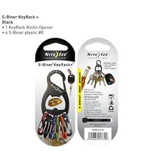 Made of high quality stainless steel, the S-Biner Key Rack + Bottle Opener (Black) has a secure gate closure on one end, allowing you to clip your keys to an existing key ring, belt loop, purse strap, zipper pull-anything with a loop or D-ring. Its interior is designed to serve as a handy bottle opener, and the other end holds six different-colored plastic S-Biners, perfectly sized to hold 6 separate keys. Identify your keys by color, and attach and release them individually from the Key Rack with ease. No more fiddling with split rings or fumbling to find the key you need-the S-Biner KeyRack + is perfect for quick and easy sharing of keys with family members, leaving a key for a valet or babysitter, taking a single key when you're out on a run or ride. And, with its added feature of the bottle opener, popping open a cool beverage for you or a thirsty friend as well--anytime, anywhere.FEATURES